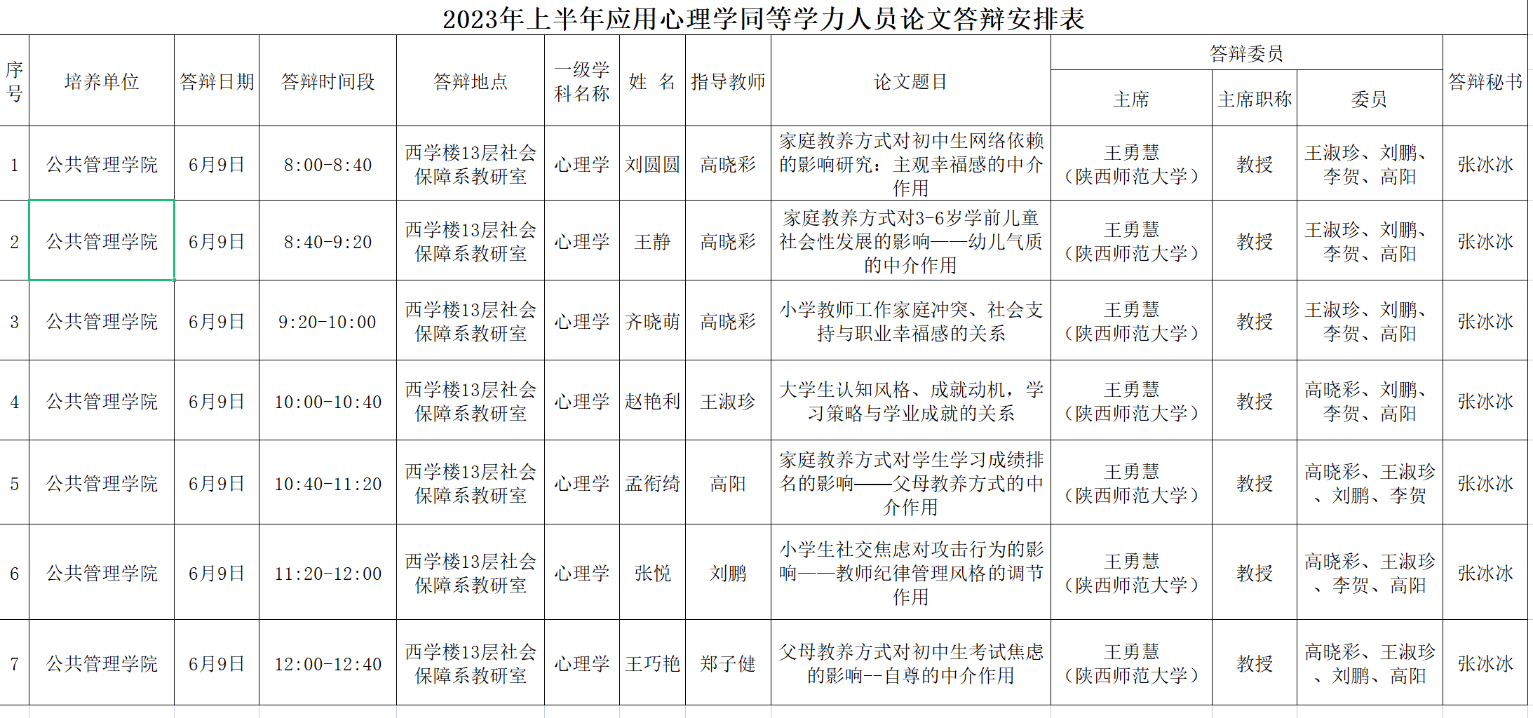 2023年上半年应用心理学同等学力人员论文答辩安排表