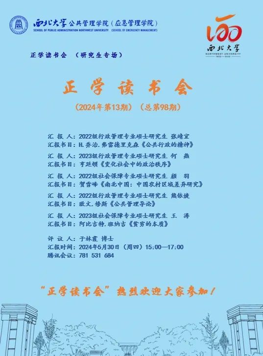 2024年5月30日下午,我院线上举办了2024年第13期正学读书会。2022级行政管理专业硕士研究生张靖宜、熊依婕,2023级行政管理专业硕士研究生何燕、2022级行政管理专业硕士研究生颜羽、2023级社会保障专业王涛分别作为主讲人进行读书汇报,公共管理专业2023级博士研究生于林霞担任评议人,部分研究生旁听了此次报告会。