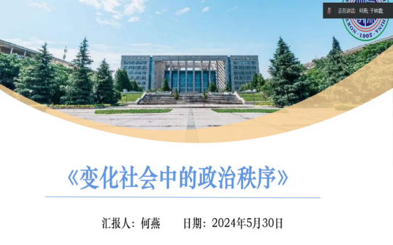 2023级行政管理专业硕士研究生何燕分享了塞缪尔·亨廷顿的《变化社会中的政治秩序》。她的汇报分为作者简介、写作背景、核心观点与阅读感悟四个部分。首先,她简要介绍了作者的学术主张和经典著作,并对本书的现实背景和学术背景进行简明介绍。其次,她从整体结构、理论框架和研究取向等方面概括了本书的大致内容。再次,她就本书中的核心观点进行讲解,对政治稳定、政治现代化、强大政府论等核心观点进行细致的梳理。最后,她对建立政治秩序和扩大政治参与两方面分享了自己的感悟。